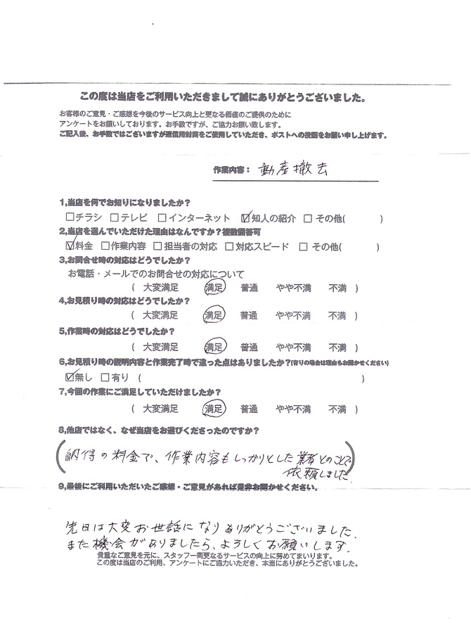 Y様(不用品回収)子ども部屋の整理でお願いしました。作業員の方2名で朝から夕方まで笑顔で対応してくれました。運び出しも機敏で掛け声も良く、見ていて気持ち良かったです。長年悩んでいた悩みの種がなくなったので気持ちも楽になりました。