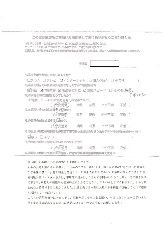 Y様(不用品回収)子ども部屋の整理でお願いしました。作業員の方2名で朝から夕方まで笑顔で対応してくれました。運び出しも機敏で掛け声も良く、見ていて気持ち良かったです。長年悩んでいた悩みの種がなくなったので気持ちも楽になりました。